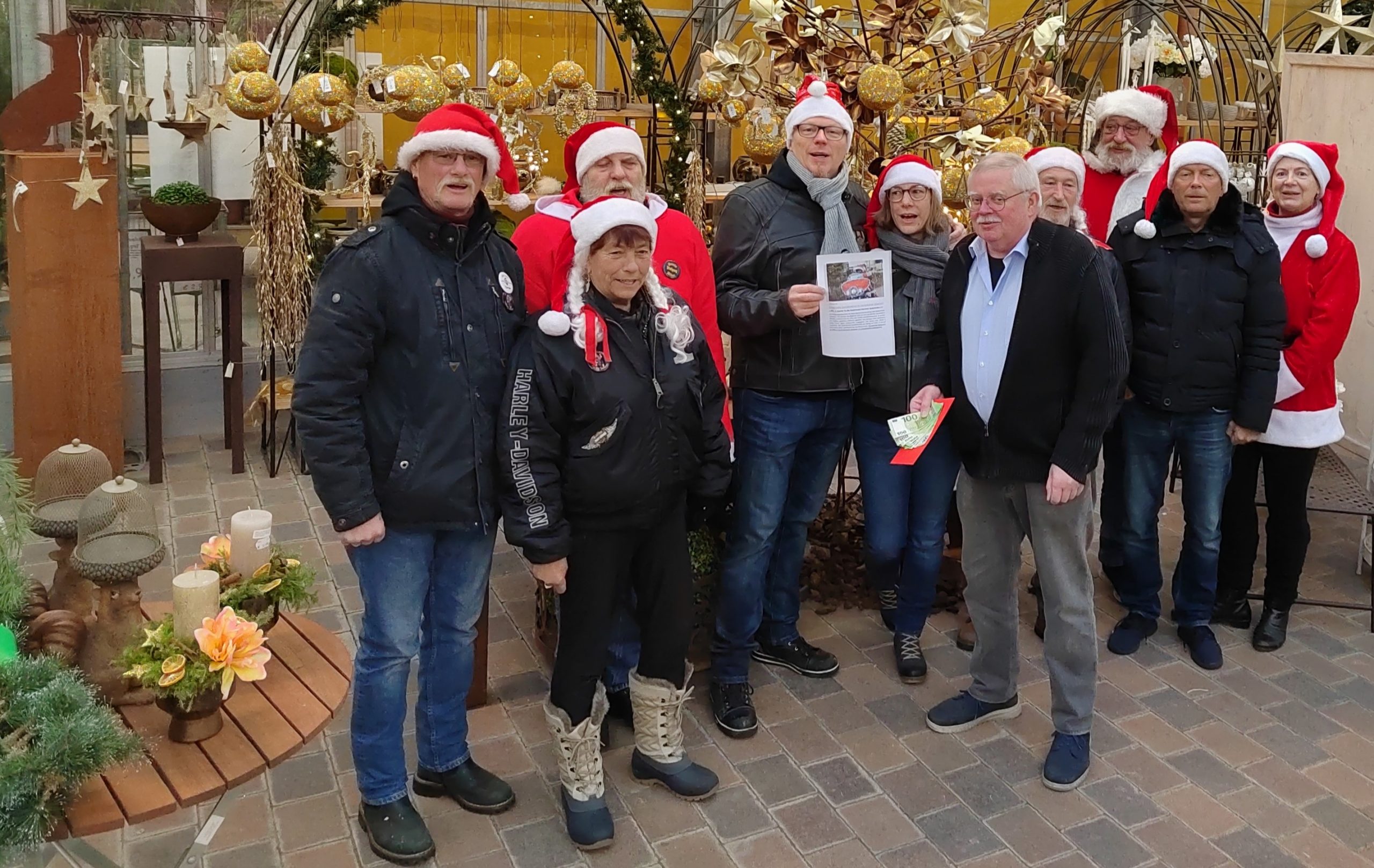 Am Nikolaustag besuchten die Riding Santas auf ihren Harleys das GCE. Hier konnten die Nikoläuse nicht nur ihre prall gefüllte Spendendose mitnehmen, sondern auch den Erlös vom Waffel- u. Glühweinstand (Glühwein gestiftet vom Weingut W. Anselmann). Es kamen über 700,- € Spenden zusammen, welche das GartenCenter auf 1000,- € erhöhte und den Riding Santas für das Kinderhospiz Sterntaler e.V. in Dudenhofen überreichte.